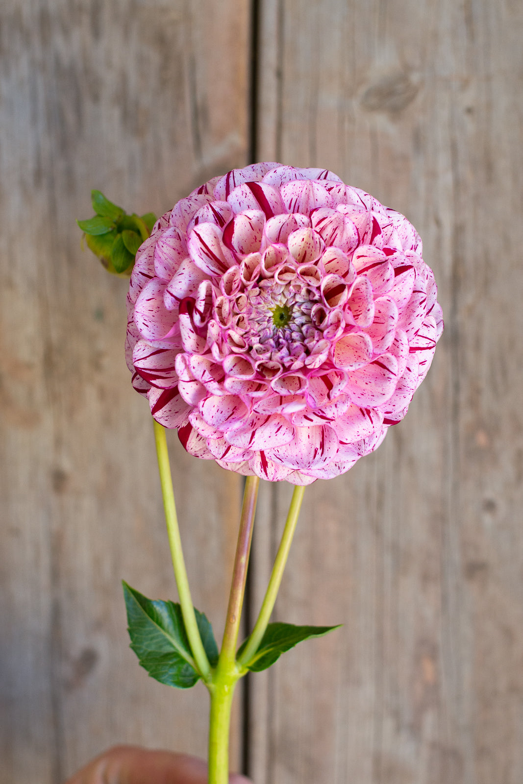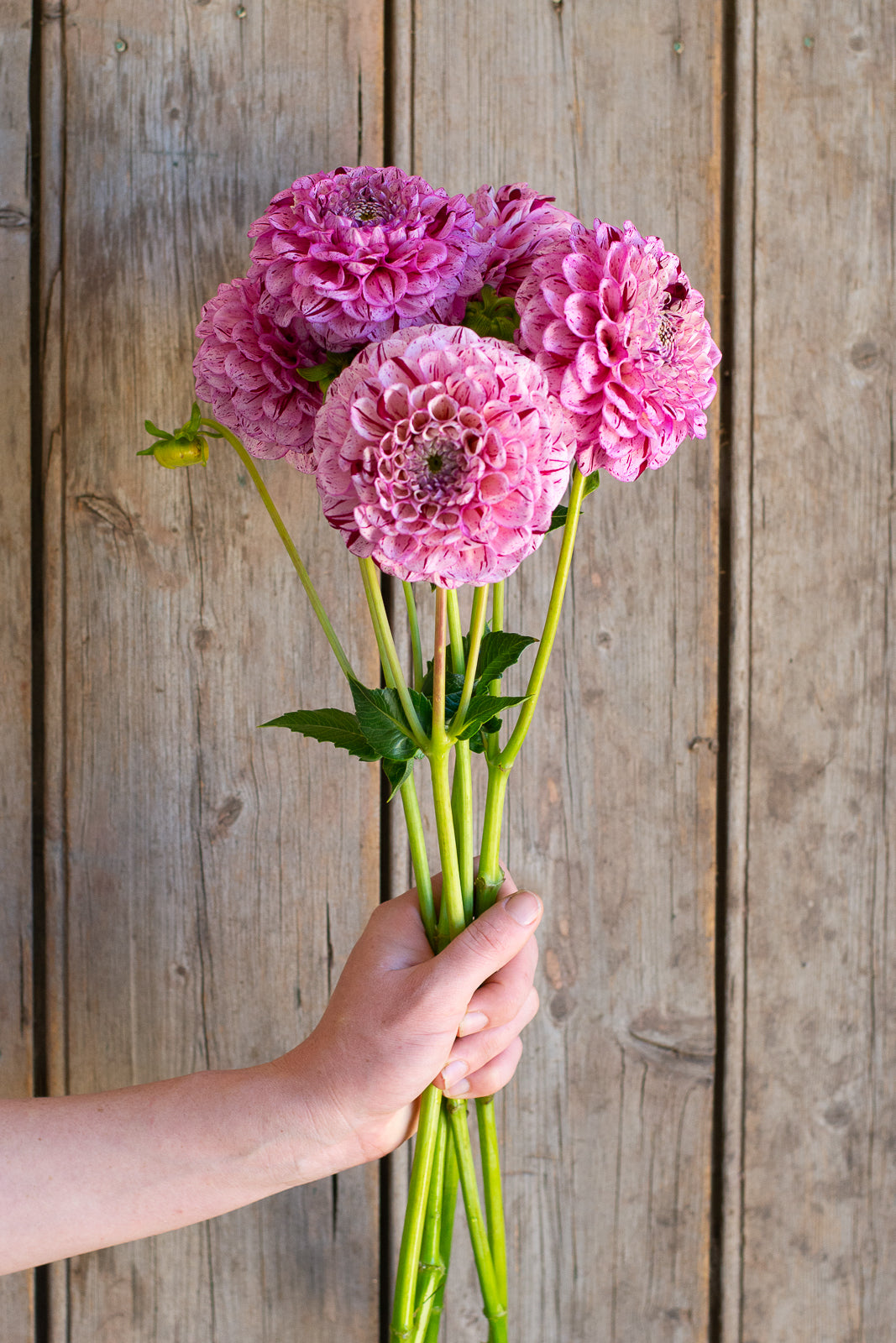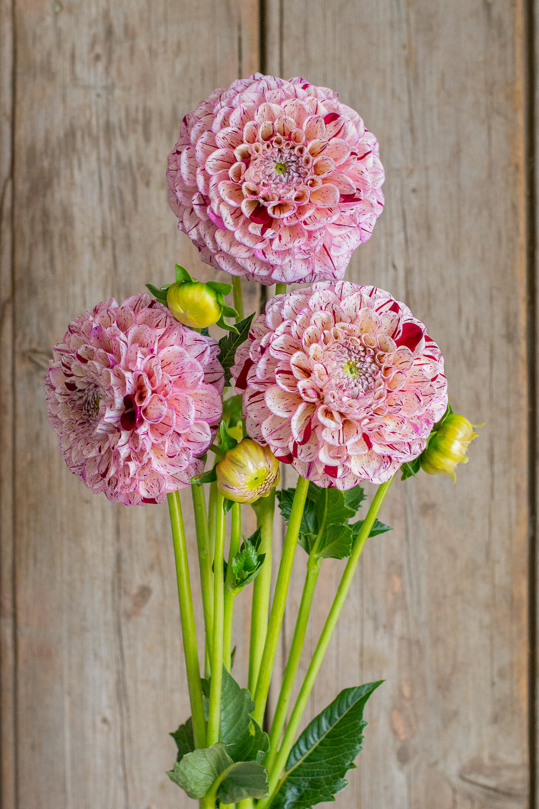 Miniature decorative pink with burgundy stripes. Reliable producer across the season. Stems are strong and ideal for picking. Flowers hold a tight center and have an excellent vase life. A fantastic cut flower.