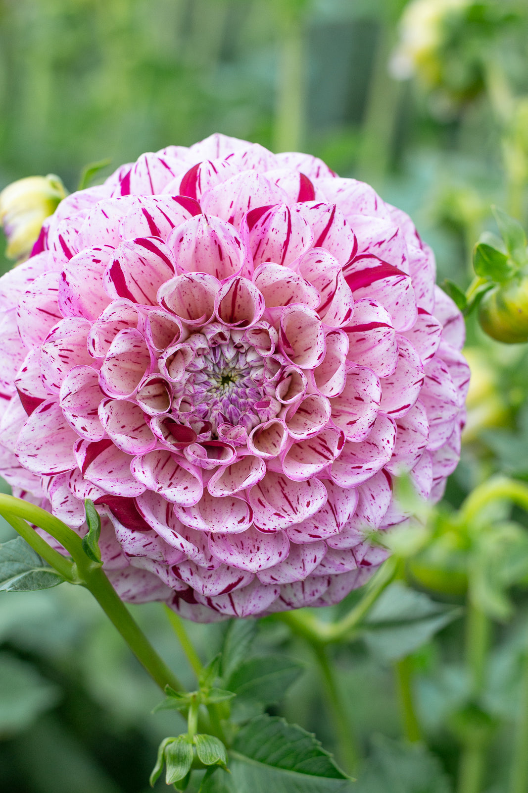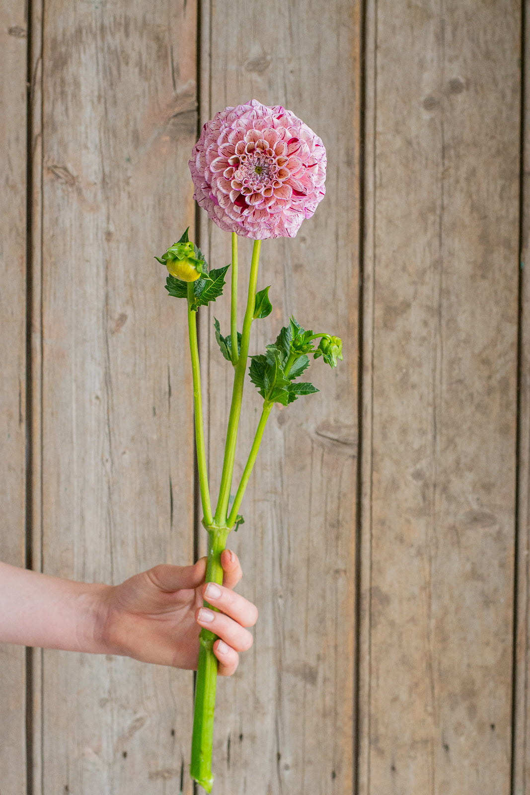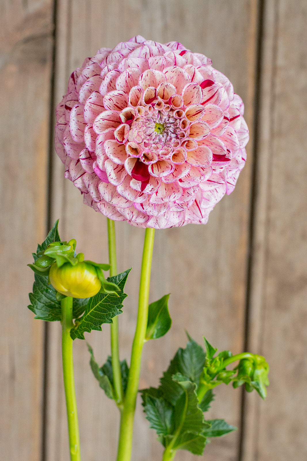 Miniature decorative pink with burgundy stripes. Reliable producer across the season. Stems are strong and ideal for picking. Flowers hold a tight center and have an excellent vase life. A fantastic cut flower.